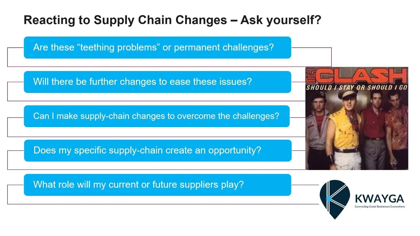 When faced with such adversity, the Kwayga team have learnt from Tony Robbins who has said that “the quality of our questions determines our success”, so the questions to consider when reacting to the above supply-chain changes are;
